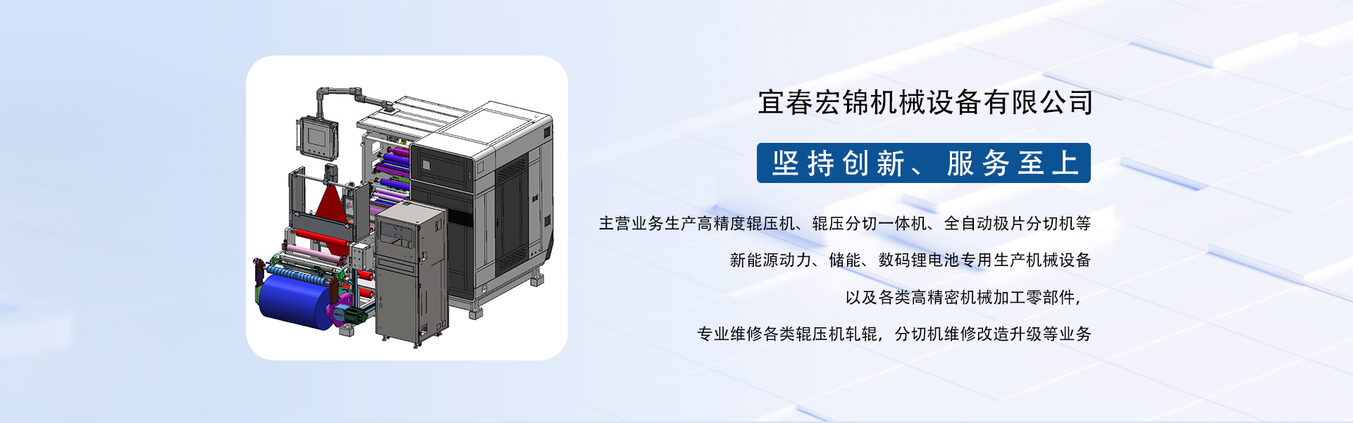 東莞市宏錦機械科技有限公司江西分公司是一家集研發(fā)、生產(chǎn)、銷售、服務(wù)于一體的創(chuàng)新型鋰電自動化精密機械設(shè)備專業(yè)制造、服務(wù)商,坐落于江西省新余市渝水區(qū)新余經(jīng)濟開發(fā)區(qū)孵化園5號廠房,廠房面積近6000平米,由東莞市宏錦機械科技有限公司于2024年11月投資新建,交通區(qū)位優(yōu)勢明顯、產(chǎn)業(yè)配套便捷集中,擁有一批具有行業(yè)豐富經(jīng)驗的技術(shù)人員和管理團隊。公司主營業(yè)務(wù)生產(chǎn)高精度輥壓機、輥壓分切一體機、全自動極片分切機等新能源動力、儲能、數(shù)碼鋰電池專用生產(chǎn)機械設(shè)備以及各類高精密機械加工零部件,專業(yè)維修各類輥壓機軋輥,分切機維修改造升級等業(yè)務(wù)。根據(jù)公司發(fā)展三步走戰(zhàn)略規(guī)劃經(jīng)營現(xiàn)下設(shè)三個二級獨立運營事業(yè)部分別為分切事業(yè)部(分切機、輥壓分切一體機)、磨輥事業(yè)部(輥壓機、軋輥修磨)、機加事業(yè)部(精密機械部件加工)。經(jīng)過十余年沉淀發(fā)展主要客戶有新余贛鋒、南昌維科、宜春清陶、云南路華、河南恒一、江西程疆、四川天萊、蕪湖天弋、惠州億緯鋰能、無錫盤古新能源、鄭州比克、安徽鋰天下、臺灣長利(宏基集團)、重慶維都利(紫建電子)、贛州諾威、安徽利維能、漳州萬寶、重慶佳寶成、廣西皇冠儲能等一批具有行業(yè)知名度和影響力的企業(yè)。公司在新能源發(fā)展的道路上堅持創(chuàng)新,為客戶帶來穩(wěn)定、高效的自動化專用設(shè)備和更大的收益。